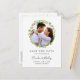 Rustic salve o cartão postal com sua dentro de foto de uma coroa verde de folha. Seus nomes estão em uma fonte de script manuscrita e seus detalhes em uma fonte de cinza média no verso. Esta design é excelente para um casamento de verão.