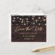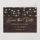 Rustic wedding save the date postcard featuring a rustic wood background adorned with string lights and the announcement elegantly scripted. Easily personalize this wedding save the date postcard with your wedding details.