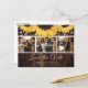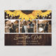 Foto personalizada de casamento de girassol rústico salva os cartões postais com colagem fotográfica e flores de girassol contra um fundo de madeira rústica adornado com luzes de cordas. Personalize facilmente esta foto rústica de girassol salve o cartão-postal com suas imagens e detalhes de casamento, incluindo um site de casamento, se desejar.
