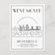 Um cartão postal de anúncio de mudança em estilo art déco moderno único para a bela cidade de Sacramento, Califórnia. Este cartão apresenta uma ilustração estilizada da silhueta única da cidade com seu nome abaixo. Isto é seguido pelas informações do seu endereço em um estilo aberto e alinhado correspondente. Todos os elementos individuais do cartão são desbloqueados, então sinta-se à vontade para alterar ou adicionar quaisquer detalhes necessários usando a função de personalização.