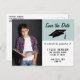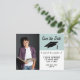 Cartão postal de anúncio de salvamento de data de formatura azul moderno. Cartão postal moderno de salvamento de data para anunciar a festa de formatura do seu graduado. O design tem texto moderno - personalize todo o texto no cartão com seus dados e um modelo de foto - insira a foto do graduado no modelo. O verso inclui um endereço de retorno personalizado. O fundo é azul e branco e inclui um chapéu de formatura.