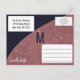Postais de Save-the-Date de casamento elegantes, sofisticados e modernos com impressão falsa de glitter rosa dourado e corte circular em bloco de cores com folha de ouro rosa em azul naval e texto em pincel falso rosa dourado. Este design clássico e sofisticado é perfeito para o casal que vai se casar e é moderno e elegante. Personalize com sua própria mensagem na frente, bem como um monograma inicial personalizado no verso. Todo o design de impressão de foto.