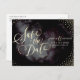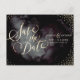 Design de caligrafia com letras à mão e confetes dourados em um fundo de aquarela escura, efeito brilhante em dourado metálico falso, moderno, chique, elegante e sofisticado, perfeito para casamento vintage ou casamento de inverno à noite. Personalize seu próprio cartão de salvar a data para o conjunto de convite de casamento.