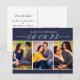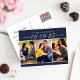 Estes cartões-postais de anúncio de salvar a data de casamento incluem três fotos de noivado de 2 x 3" com a data apresentada em escrita cursiva. Personalize o texto do modelo de cartão na frente e no verso do cartão-postal para o seu grande dia. As cores de fundo azul meia-noite / azul-marinho e as cores do texto podem ser personalizadas para combinar com a paleta de cores do seu casamento.