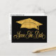 Envie este cartão-postal elegante e elegante preto e falso de graduação em ouro para sua família e amigos. Graduação Salva a data do cartão postal moderno e simples design apresenta um boné de formatura.