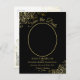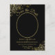 Este belo cartão de salvar data é projetado para dar aos seus amigos e familiares um aviso prévio do seu casamento. Ele apresenta um design simples, mas elegante, com texto dourado em fundo preto e sua foto em uma moldura oval rodeada por espirais e caracóis dourados de falso folheado. O verso tem um gráfico fofo que diz "marque-nos" e espaço para uma nota personalizada.