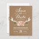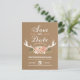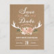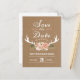 Enviar um na moda para salvar o cartão postal de data como um gráfico floral antler. Personalize o texto de ambos os lados com detalhes sobre o seu casamento.