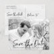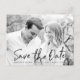 Casamento moderno de na moda salve os cartões postais de data com uma sobreposição de fontes de script de tendência preta, espaços reservados para o seu texto personalizado e foto de noivado, e fundo de mármore branco. A parte traseira do cartão postal apresenta a opção de texto personalizado ou pode ser deixada vazio para uma mensagem manuscrita.