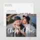 Cartões-postais de mudança de planos elegantes e modernos exibindo sua foto de noivado horizontal favorita com "Mudança de Planos" em uma sobreposição de script de pincel moderno e branco. Personalize a frente do cartão de mudança de planos da foto adicionando seus nomes e texto de adiamento do casamento. O verso do cartão-postal apresenta seu endereço de devolução, nomes, site do casamento, etc.