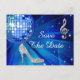 Elegante, glamouroso 50º Aniversário / 50º Aniversário salvam os cartões postais. Trendy glitz e glamour Salve as datas para as comemorações da 50ª / 5ª festa de aniversário. Bela e deslumbrante prata brilha os diamantes borbulhando joias de notas musicais, a bola de espelhamento azul-funk na discoteca e a brilha prateada suavizam a imagem de calçado de moda de alto salto em um fundo azul-chic. Um bonitinho, elegante, na moda, bonito, guarde o cartão postal para as festas de aniversário femininas. As mulheres vão adorar este design legal, divertido, engraçado e feminino por sua música glamourosa e dançando 50/50 festas.