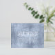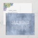 Fontes únicas, suculentas coloridas em aquarela e fundos cintilantes em um tom azul suave e empoeirado são os destaques destes produtos de casamento personalizáveis. Este cartão postal de "Save the Date" de casamento fornece um modelo para adicionar seus próprios nomes, data de casamento e mensagem em um formato fácil para correio de devolução. Um padrão brilhante e texturizado, em tons claros e escuros de azul empoeirado, adiciona um fundo contrastante no verso. Procure por ID515 para ver todos os produtos correspondentes deste conjunto.
