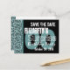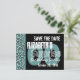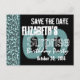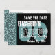 Aqui está um design moderno para um convite de "salve a data" para uma festa de aniversário SURPRESA, um padrão geométrico em azul turquesa ou aqua com detalhes em preto. Moderno e elegante!