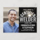 Compartilhe a alegria da formatura de uma escola de solda e convide familiares e amigos para celebrar com anúncios personalizados de "Soldador Certificado" com foto. A imagem e todas as palavras neste modelo são simples de personalizar com quaisquer detalhes de sua escolha, incluindo nome do graduado, ano da turma, informações de convite para a festa, certificação de solda, título do diploma, citação inspiradora favorita ou planos para o futuro. O design preto e branco apresenta um maçarico de solda com faíscas, um birrete de aço inoxidável falso, tipografia moderna e negrito, e uma foto de sua escolha. Por favor, note que o gorro de formatura prateado é uma cor impressa, não uma folha metálica. Esses cartões de anúncio de formatura elegantes são uma maneira sofisticada de compartilhar a celebração de um dia especial com familiares e amigos. Parabén