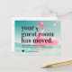 Cartão-postal Tropical Rosa Flamingo, Novo Endereço, Sala de Convidado em Movimento O design apresenta uma escrita moderna e tipografia de fontes e um coração num flamingo cor-de-rosa numa foto ao lado da praia ou do litoral. Excelente para aqueles que se mudam para áreas ensolaradas, tropicais, de praia ou cidades como a Flórida ou a Califórnia.