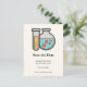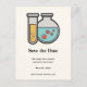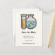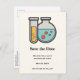 Cartão postal de salvar a data com uma ilustração fofa de um tubo de ensaio segurando líquido amarelo e um frasco/béquer arredondado segurando líquido verde com bolhas vermelhas.