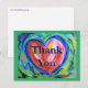 A mensagem no cartão-postal diz: "Obrigado". A pintura apresenta um coração vermelho colorido com brilhos de branco e acentos dourados. O coração é delineado em azul e tem um fundo verde suave. Esta pintura do coração é uma homenagem a manter a esperança dentro do seu coração quando os azuis tristes o cercam, mas avançando em direção ao verde renovador.