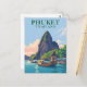 Fugir para as praias deslumbrantes de Phuket, Tailândia, com este cartão postal de ilustração estilo vintage. Com barcos de cauda longa, palmeiras e barco, este cartão postal colecionável evoca a beleza eterna da localização tropical da Tailândia