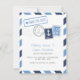 Cartão Save the Date Inspirado em Correio Aéreo em Azul Marinho e Azul Pó. Selos Falsos e Marcações de Postagem para um Casamento com Tema de Viagem e Náutico.