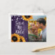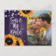 Cartão postal de salvar a data de casamento com foto rústica de girassóis e roxos com luzinhas num fundo de madeira rústica. Cartão postal ideal para um casamento rústico roxo no campo ou num celeiro inspirado em girassóis.