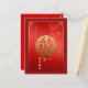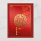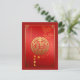 Grande ideograma de ouro Fu de boa sorte ou fortuna + nuvens chinesas auspiciosas + Feliz Ano Novo Chinês + desejos em chinês + Ano do boi e pequeno corte de papel de boi em cor vermelha de gradiente como fundo. Design no cartão postal vertical com o mesmo ideograma e nuvens auspiciosas dentro a placa. Cartão de saudação correspondente.