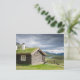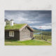 Cartão postal com uma cabana de madeira de cobertura suja com vista sobre um vale no Parque Nacional de Jotunheimen sob um céu escuro na Noruega.