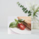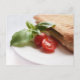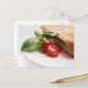 Cartão postal de uma comida italiana saudável, constituída por um sanduíche de panini e um tomate, folhas de manjericão verde e queijo mozzarella de fundo branco.