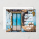 Este cartão postal colorido de casa nova é perfeito para dar parabéns por uma nova casa. O design urbano minimalista e colorido apresenta uma parede azul, bege e marrom e uma porta azul, bem como um texto sobreposto em caligrafia branca "Desejando amor, felicidade e alegria em sua nova casa". Personalize o texto na frente se desejar.
