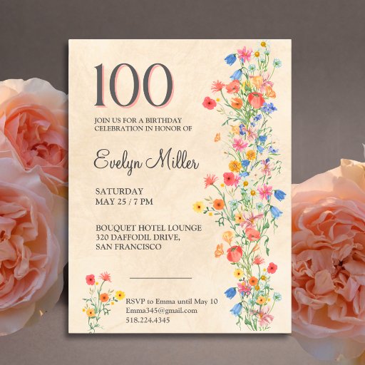 Cartão Postal De Convite 100.º aniversário - Flores selvagens elegantes