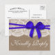 A coleção de casamento do arco azul rústico é um design impressionante que apresenta um adorável fundo de efeito de burvolta rústico com um romântico efeito de renda branca vintage e um espantoso arco azul escuro. Esses cartões postais RSVP podem ser personalizados para sua ocasião especial e fariam o cartão de resposta perfeito para qualquer casamento rústico, chá de panela, festa de noivado, festa de aniversário e muito, muito mais. *Observe que o Zazzle só vende cartões postais impressos para que esses cartões postais não tenham nenhum material real de burlap, renda ou fita/ arco.