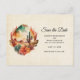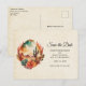 Salve o cartão postal de data com uma bela ilustração pintada. Cactos verdes e montanhas marrons com flores laranja do deserto. Cênico bonito design a sudoeste.