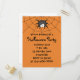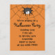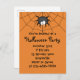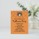A festa de Halloween convida em laranja e preto. Modelos para adicionar todos os seus detalhes. No topo e na parte de trás está uma linda aranha preta de desenho animado com grandes olhos engraçados e pequenas presas brancas, sentadas em sua teia.