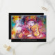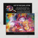 Amor romântico entre Arlecchino e Colombina: Colorido, caprichoso tocador de violino, uma bela mulher loira em trajes cintilantes com penas e floreios de burgundy vermelho no verso do cartão. .Pintura em aquarela por Bulgan Lumini (c) em cores rosa brilhante, fúcsia, verde, vermelho, azul, amarelo, com brilhos dourados inspirados na Comédia da Arte (Commedia dell'arte) e Carnaval de Veneza.