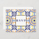 Este cartão postal de RSVP de casamento inspirado no Mediterrâneo apresenta bordas de azulejos espanhóis tradicionais extravagantes e elegantes em amarelo e azul naval.