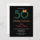 Cartão postal de 50º convite de aniversário verde elegante. Perfeito para uma comemoração na moda feminina de cinquenta por dia. Possui 5 e 0 dígitos feitos de folhas verdes e borboletas laranja ouro no fundo preto. Você pode personalizar facilmente seu convite usando ferramentas online do Zazzle. Se precisar de ajuda na personalização deste cartão, não hesite em contactar-me através do Zazzle.