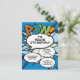 Um divertido, azul, legal e moderno gibi inspirou um convite de aniversário que coloca o wham, zap, pow no evento de celebração de aniversário de qualquer super-herói. O reverso apresenta um padrão de bolinhas de quadrinhos azuis correspondente que você pode substituir por sua própria imagem ou foto. Projetado por Thisnotme©