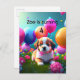 Esta design apresenta um filhote branco e marrom giro num campo de flores com balões coloridos. Perfeito para o Convite de aniversário do Kid! Personalizável. Projetado por AlMarion