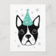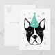 Cartão postal de aniversário com uma ilustração de um Boston terrier usando um chapéu de festa azul turquesa. O cachorro está cercado por estrelas cinza prateado.
