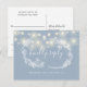 Um cartão de resposta azul empoeirado com luzes de corda bonitas, guirlanda floral desenhada à mão e tipografia elegante. O verso apresenta seus detalhes e um divertido pedido de música para o convidado. Projetado por Thisisnotme