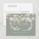 Um cartão de resposta verde sálvia com luzes de corda bonitas, grinalda floral desenhada à mão e tipografia elegante. O verso apresenta seus detalhes e um divertido pedido de música para o convidado. Projetado por Thisisnotme