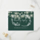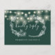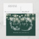 Um cartão de RSVP verde esmeralda com lindas luzes de corda, grinalda floral desenhada à mão e tipografia elegante. O verso apresenta seus detalhes e um divertido pedido de música para o convidado. Desenhado por Thisisnotme©