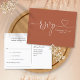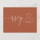 Um cartão de resposta elegante com letra em coração sobre um fundo de terracota. O verso apresenta seus detalhes e uma divertida solicitação de música para o convidado. Criado por Thisisnotme©