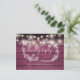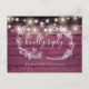 Um cartão de RSVP rústico com belas luzes de corda, guirlanda floral desenhada à mão e tipografia elegante em um fundo de painéis de madeira vermelha burgundy. O verso apresenta seus detalhes e um divertido pedido de música para o convidado. Criado por Thisisnotme©