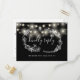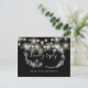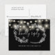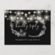 Um cartão de RSVP preto e branco com luzes de corda bonitas, guirlanda floral desenhada à mão e tipografia elegante. O verso apresenta seus detalhes e uma divertida solicitação de música para os convidados. Criado por Thisisnotme©
