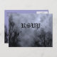 Um postal de RSVP personalizado com um fundo de um céu de Halloween assustador com árvores negras ao longo de uma estrada assombrada, corvos góticos e uma lua de cheio nublada com neblina azul. A frente tem RSVP em uma fonte gótica preta, a parte de trás tem espaço para suas datas personalizadas e seu endereço de retorno. Clique em Personalizar para alterar fontes, dimensionamento, texto e muito mais, e até salvar seu design para mais tarde.