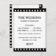 Os buracos de fotos ao longo de cima e de baixo dão a impressão de um filme para acompanhar 'O Casamento - Uma História do Verdadeiro Amor' cuja estreia mundial será a data do casamento. Totalmente personalizável na frente e no verso deste cartão para respostas de convidados irá apelar para casais de casamento com interesse nas artes cênicas.