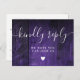 Um cartão RSVP de madeira russa púrpura com tipografia quic. O inverso apresenta os seus detalhes e uma solicitação divertida de música de convidado. Projetado por Thisnotme©
