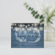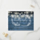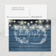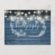 Um cartão RSVP rústico com luzes de cordas bonito, uma garland floral desenhada à mão e uma tipografia quic num fundo de painéis de madeira azul. O inverso apresenta os seus detalhes e uma solicitação divertida de música de convidado. Projetado por Thisnotme©