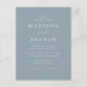 Cartaz de convite para casamento minimalista e moderno com detalhes de seu casamento em letras brancas com sotaques de escrita de caligrafia. O fundo azul empoeirado pode ser alterado para uma cor de sua escolha. Personalize a parte de trás do cartão postal do convite de casamento com seu endereço de volta, site do casamento, imagens, etc. Projetado para coordenar com a nossa coleção de casamento do Modern Elegance.