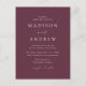 Cartaz de convite para casamento minimalista e moderno com detalhes de seu casamento em letras brancas com sotaques de escrita de caligrafia. O fundo púrpura de vinho pode ser mudado para uma cor de sua escolha. Personalize a parte traseira do cartão postal do convite de casamento chic com seu endereço de devolução, data de resposta desejada, site de casamento e instruções para os convidados usando as modelos de texto fornecidas. Projetado para coordenar com a nossa coleção de casamento do Modern Elegance.