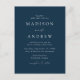 Cartaz de convite para casamento minimalista e moderno com detalhes de seu casamento em letras brancas com sotaques de escrita de caligrafia. O fundo do marinho pode ser alterado para uma cor de sua escolha. Personalize a parte traseira do cartão postal do convite de casamento chic com seu endereço de devolução, data de resposta desejada, site de casamento e instruções para os convidados usando as modelos de texto fornecidas. Projetado para coordenar com a nossa coleção de casamento do Modern Elegance.